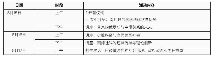 中国药科大学国际医药商学院 2020年优秀大学生夏令营 暨2021年推免生预选拔报名工作的通知 中国药科大学国际医药商学院是立足于中国药科大学药学学科优势、实现经管法与药学多学科交叉融合、服务于国家卫生健康事业、培养具有药学背景的复合型高层次经管人才的教学科研单位。学院本科、硕士、博士培养层次完善,学术学位、专业学位硕士培养类型齐全,拥有高水平的导师队伍和科研团队,具有良好的研究生培养条件和环境。 为进一步拓宽生源渠道,聚天下英才而育之,特开展2020年优秀大学生暑期夏令营活动及2021年推免生预选拔工作,有关事项通知如下。 1 举办形式及时间 1、组织形式 考虑当前疫情防控要求,本次夏令营活动采用网络线上形式开展,网络平台使用钉钉或腾讯会议。 2、举办时间 活动报名: 7月9日17:00—7月16日17:00 参营确认:7月17日12:00—7月18日8:00 活动开幕:7月19日上午9:00—9:30 专业考核:7月19日9:30开始 (各专业考核安排将依参营人数而定,另行通知) 2 活动流程及要求 1、活动报名 有意参加且符合条件的全国各院校学生可在规定时间内登录我校夏令营报名系统进行报名 (网址:https://yzs.cpu.edu.cn/logon),并按提示上传报名材料。 上传材料包括: 1)本科阶段历年成绩单(需教务部门盖章); 2)本科阶段综合成绩排名证明(需院系签字盖章); 3)外语水平证明; 4)有关获奖证书和学术科研成果证明。 2、资格审核 学院根据学校研究生院制订的招生政策、参营条件和人数等对报名参营的学生进行资格审核,向符合条件、入围的学生在系统中发送通知,收到通知的学生需在规定时间内在报名系统中确认是否参加,逾时不确认者视为主动放弃。 3、专业考核 学院组织专家对参营学生进行专业考核,考核按招生专业分组进行,采取网络平台面试的方式,面试时间、形式、顺序、优秀营员评选等另行通知。优秀营员评选结果可在系统中查看。 各营员需保证自己具备网络面试的网络条件、环境等。 我院2021年硕士研究生招生专业为: 学术学位:社会与管理药学、药物经济学、公共管理 专业学位:药学—管理药学、国际药品注册、监管科学方向 3 选拔要求与招生政策 (一)参营条件 1、具有良好的思想品德和政治素质,遵纪守法,身心健康。 2、全国高校2021届应届本科毕业生,所学专业为药学类、中药学类、化学类、生物科学类、化工与制药类、生物医学工程类、生物工程类、基础医学类、食品科学与工程类、经济学类、统计学类、管理学类等相关专业,优先接收来自“双一流”建设高校的学生。 3、本科期间学习成绩优异,来自于“双一流”建设高校的学生截至目前总评成绩在本专业排名前25%;普通类高校的学生截至目前总评成绩在本专业排名前5%;或预计可获得所在高校免试推荐资格的学生。 4、具有良好的英语水平,CET-6成绩合格(≥425分)等。 5、学院根据自身学科特色、学科发展需要、往年录取情况、学生报名情况等,综合考察、严格审核、择优选拔。 (二)参营规模 根据学校研究生院的指导意见和学院实际情况,本次夏令营参营规模上限为100人。 (三)招生政策 凡全程参加学院暑期夏令营,且学科组考核被评为优秀营员的学生,若获得所在学校推荐免试研究生资格,同等条件下征得拟报考导师同意后优先拟录取为我校2021年硕士研究生,无需再参加我校推免生复试。“优秀营员”资格仅限在其所参加考核的同一学院同一个二级学科内录取时有效。 4 其它 国际医药商学院研究生招生工作领导小组具体负责本次夏令营活动的组织领导工作,并负责对活动方案、专业考核等作出解释。联系人:刘老师,联系电话:025-86185036。 中国药科大学国际医药商学院 2020年7月8日 南京师范大学公管院 2020年优秀大学生网络学术 夏令营通知 为加强南京师范大学公共管理学院与国内大学相关院系的联系、促进全国优秀大学生交流,增强广大有志青年学术互动,激发青年学生对哲学、政治学、行政管理领域研究的兴趣,学院将于2020年8月15-17日举办2020年优秀大学生网络学术夏令营活动。 1 申请对象 (一)哲学专业 1.来自具有推免资格的本科院校相关专业(不限哲学专业),有志于哲学领域研究,具有较强科研潜力的大学本科三年级学生(2021年毕业),本科前五个学期在所在专业年级排名前40%; 2.来自普通本科以上院校相关专业(不限哲学专业),有报考我院哲学专业研究生计划,具有较强科研潜力的大学本科三年级学生(2021年毕业),本科前五个学期在所在专业年级排名前40%; 3.来自普通本科以上院校相关专业(不限哲学专业),对哲学专业有浓厚兴趣,具有科研潜力的大学一二年级学生。 (二)政治学专业 1.来自具有推免资格的本科院校相关专业(不限政治学专业),有志于政治学领域研究,具有较强科研潜力的大学本科三年级学生(2021年毕业),本科前五个学期在所在专业年级排名前30%(强化部和试验班的可适当放宽比例); 2.来自普通本科以上院校相关专业(不限政治学专业),有报考我院政治学专业研究生计划,具有较强科研潜力的大学本科三年级学生(2021年毕业),本科前五个学期在所在专业年级排名前30%. (三)行政管理专业 1.来自具有推免资格的本科院校行政管理相关专业,有志于行政管理、公共政策、社区治理、人力资源管理、中国政府治理等领域研究,具有较强科研潜力的大学本科三年级学生(