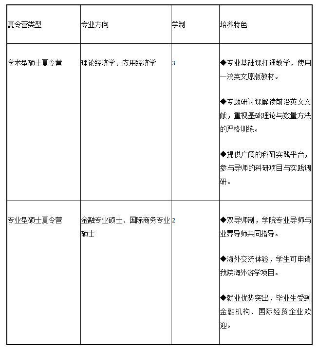 2020年夏令营将包括学术型硕士夏令营、专业型硕士夏令营两个分营。学术型硕士夏令营旨在招收有志于从事经济学术研究的优秀毕业生,入学一年可申请硕博连读;专业型硕士夏令营招收有志于在银行、证券、基金、外企及政府部门从事金融、国际商务领域工作的应用型优秀毕业生。在夏令营中表现突出的营员,将授予“优秀营员”称号,获得本科学校的推荐免试资格后可优先选择导师。